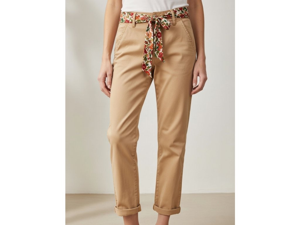 Detaily: klasické chino kapsy vpředu i vzadu, zip + knoflík (nebo háček), čisté provedení bez zbytečných zipů nebo výšivek
