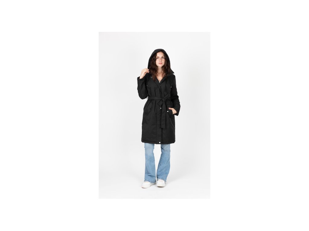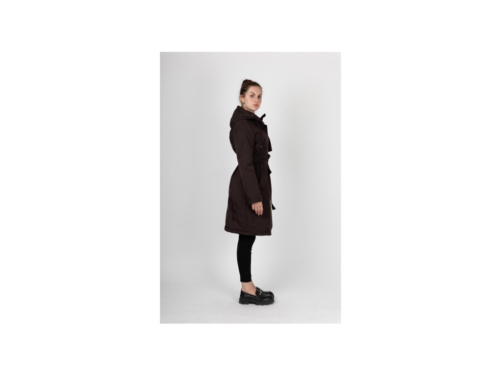 Dámská stylová parka s kapucí. V pase regulace na stažení, doplněno páskem. Parka má zapínání na zip a klopu na druky.