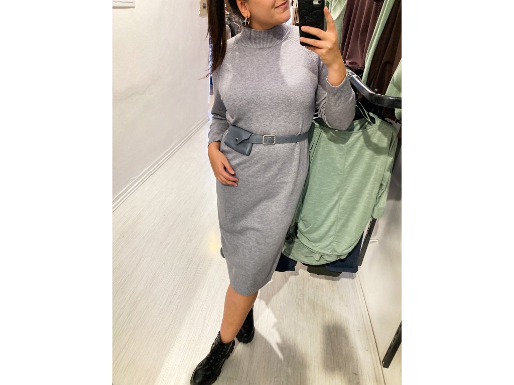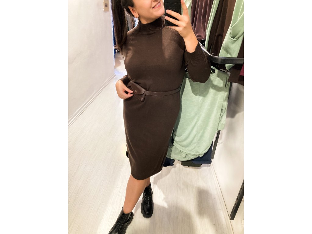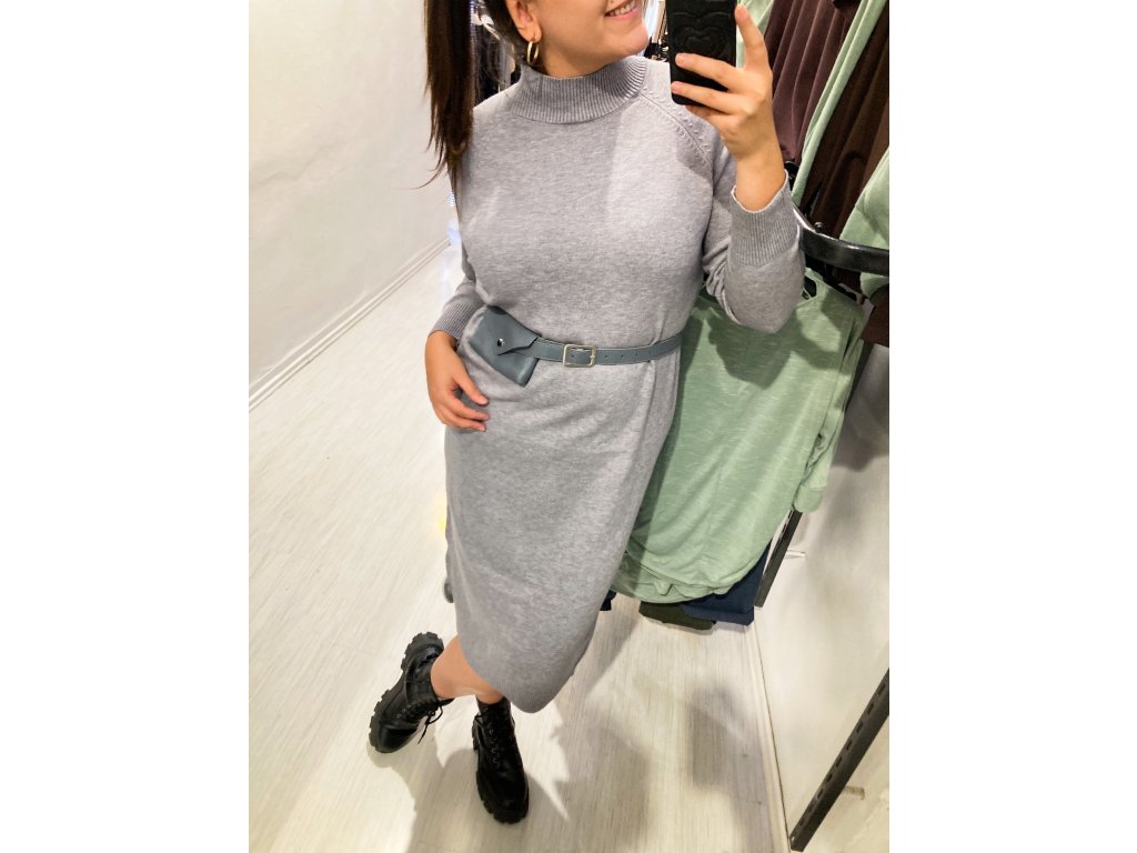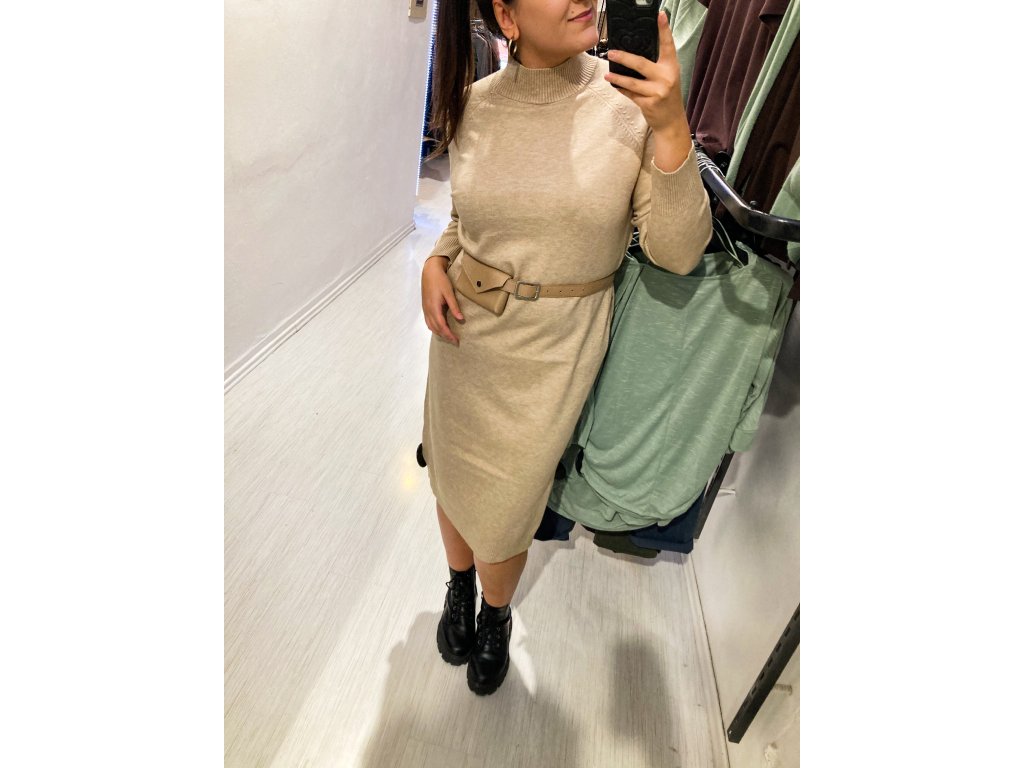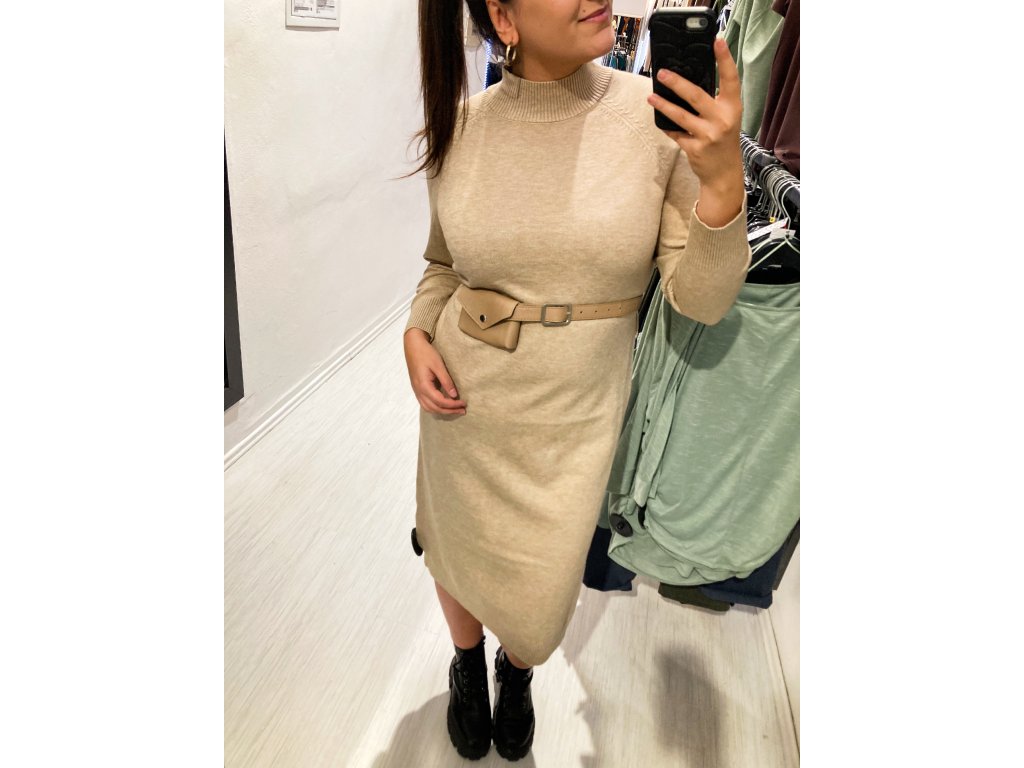 Design a střih: Dlouhé, přiléhavé pletené šaty se stojáčkem a dlouhými rukávy. Šaty které padnou do midi délky (přibližně pod kolena). Mají jemně strukturovaný pletený vzor pro elegantní vzhled, ale zůstávají super pohodlné díky elastickému materiálu. Hlavní hvězdou je koženkový pásek v barvě, který se nosí na bocích – upravuje siřku a dodává moderní akcent. Na pásku je připevněné malé pouzdro (belt bag) s kovovým sponou, ideální na klíče, telefon nebo drobnosti, takže máte ruce volné bez nutnosti brát tašku.