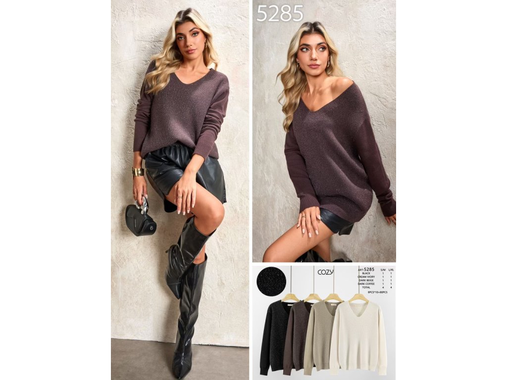 Krásný ženský svetřík s výstřihem do V. Přední a zadní díl je protkán lurexovou nití a rukávy jsou hladkého úpletu bez lurexu. Na omak neskutečně příjemný, šik a vhodný jak na denní nošení tak také jako nenucená elegance na společenskou událost. Rychle se vyprodává.