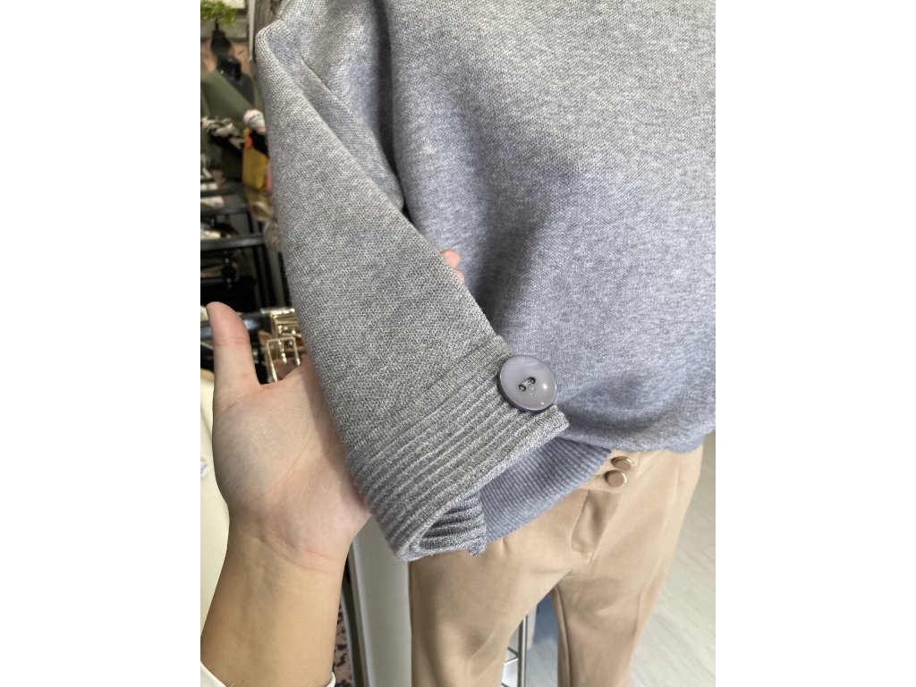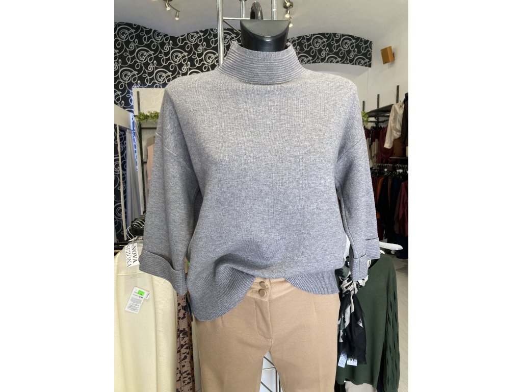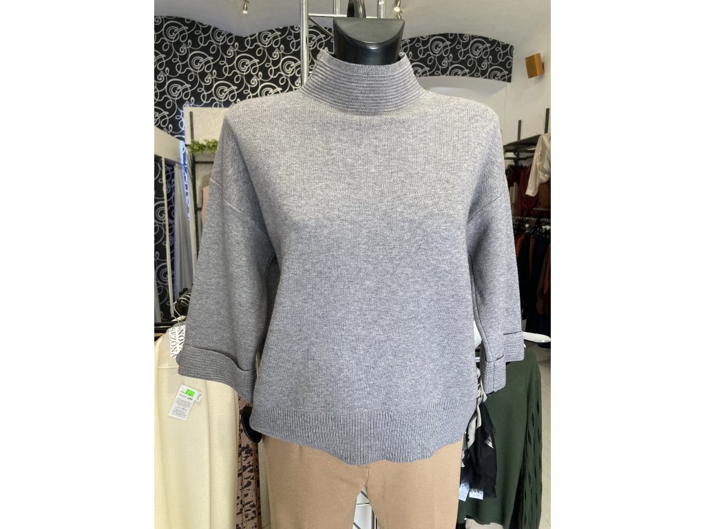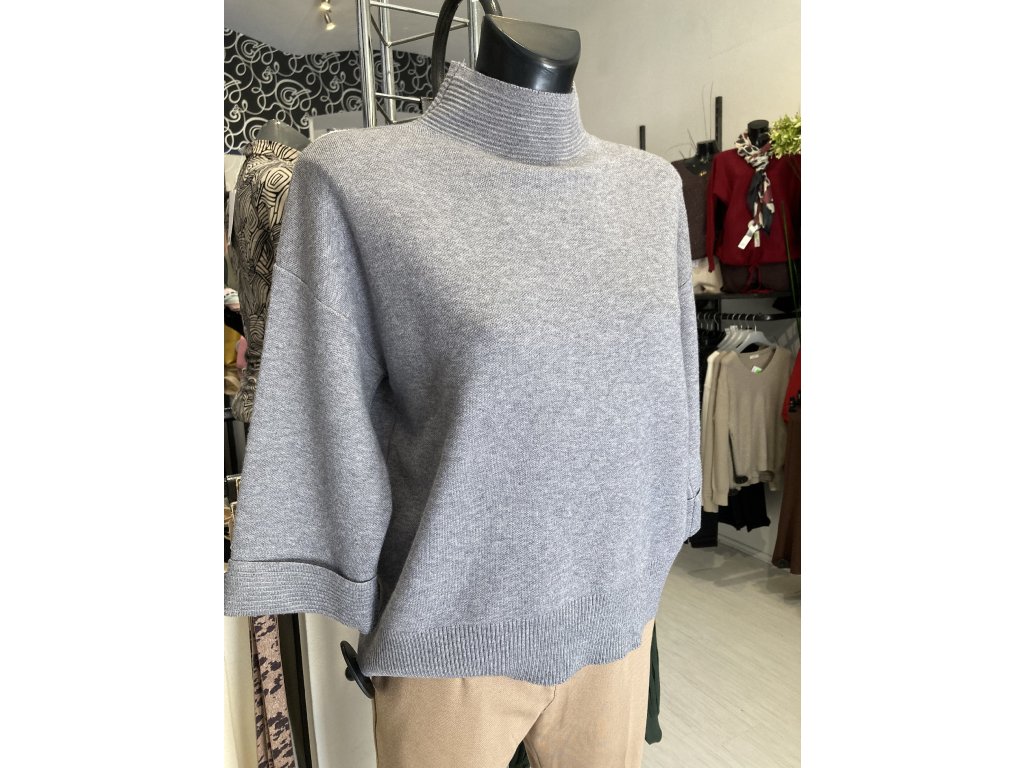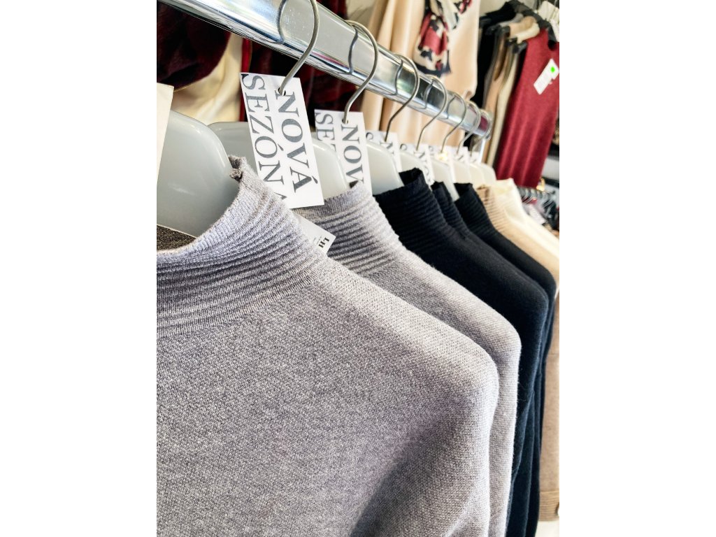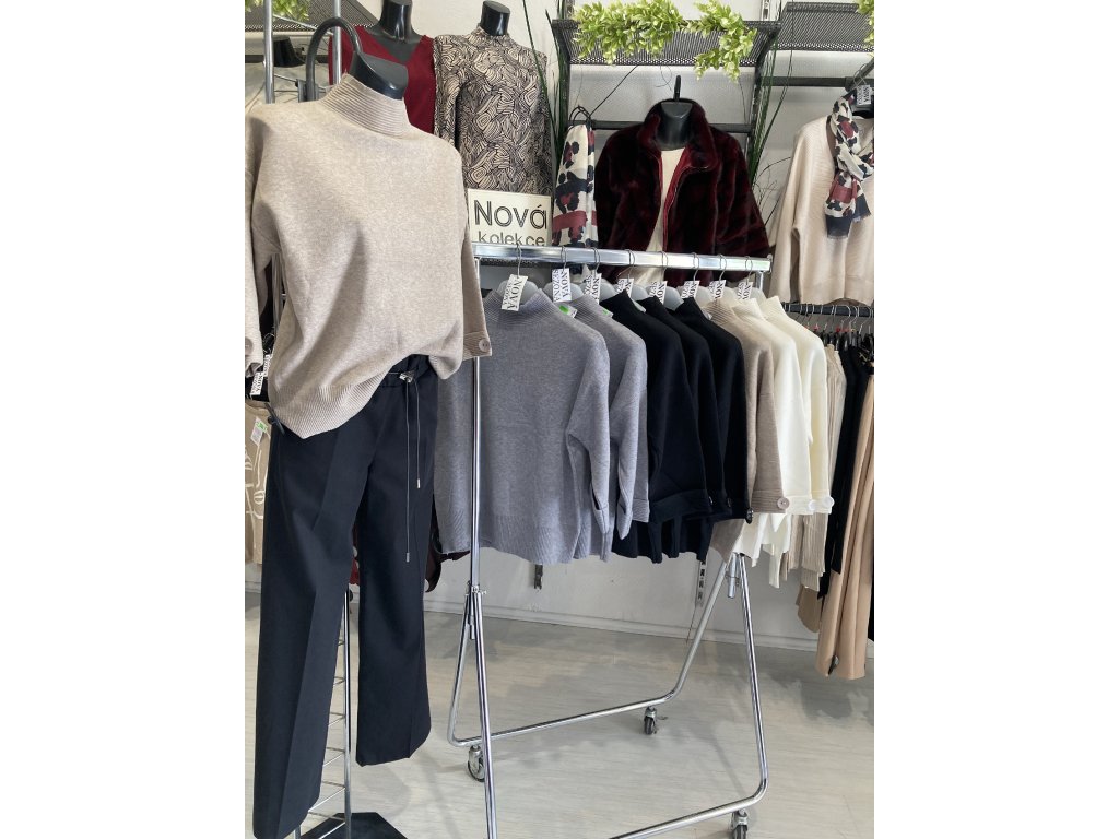 Velmi módní svetřík designového střihu s elegantním stojáčkem a efektními rukávy. Velikost UNI - lehce oversized.