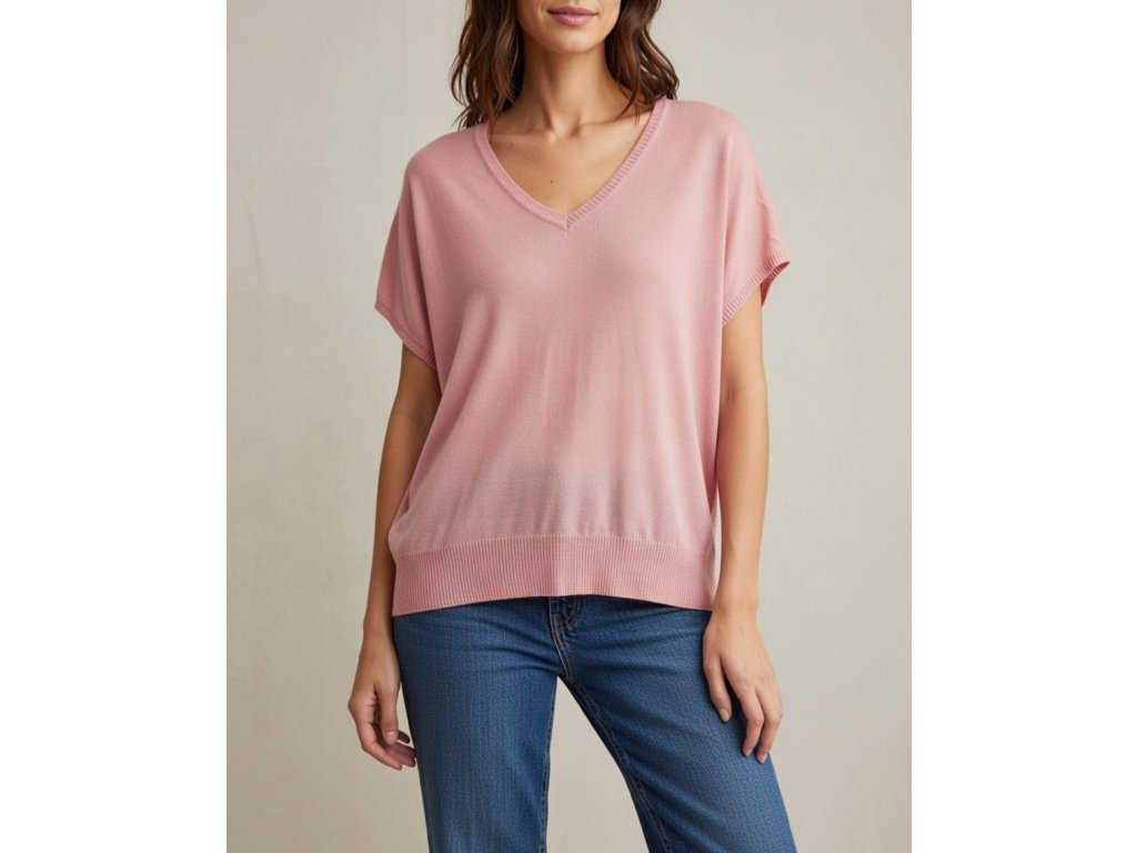 Dámský svetřík s krátkým rukávem. Svetr má výstřih do V, jednoduchý střih.